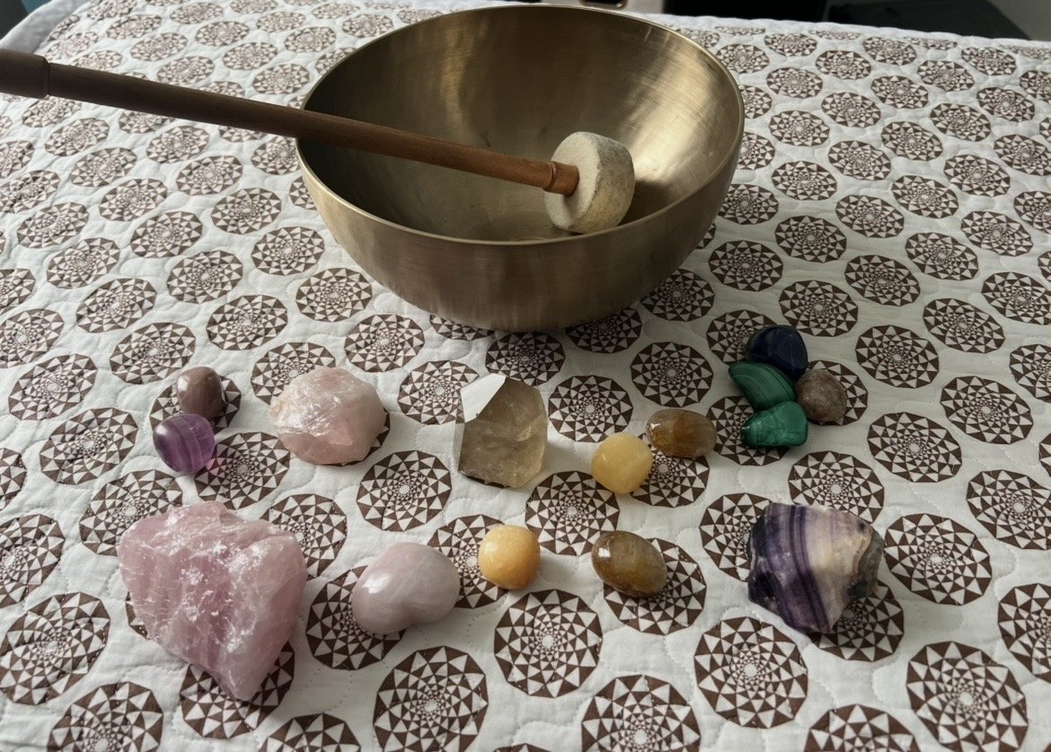A variety of stones are intuitively chosen, working with an intention personal to you and brought into this serene session. Stones are placed on chakra points and around body. The vibration of crystals combined with vibration of sound bowls work together to bring your body and spirit what is needed.